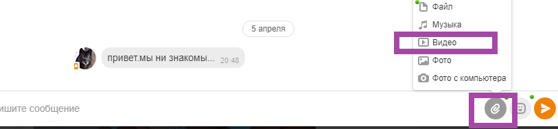 Одноклассники предоставляют возможность отправки в личных сообщениях различных файлов (текстовые документы, фото и видео). Для этого предусмотрена кнопка с изображением скрепки. Нажав на неё, вы сможете выбрать необходимый файл.