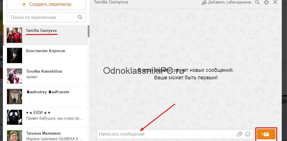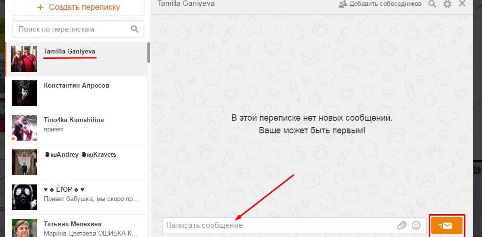 Для отправки послания нажимаем круглую оранжевую кнопку со стрелочкой. При наведении курсора, появляется надпись «Отправить» или изображение стрелочки .