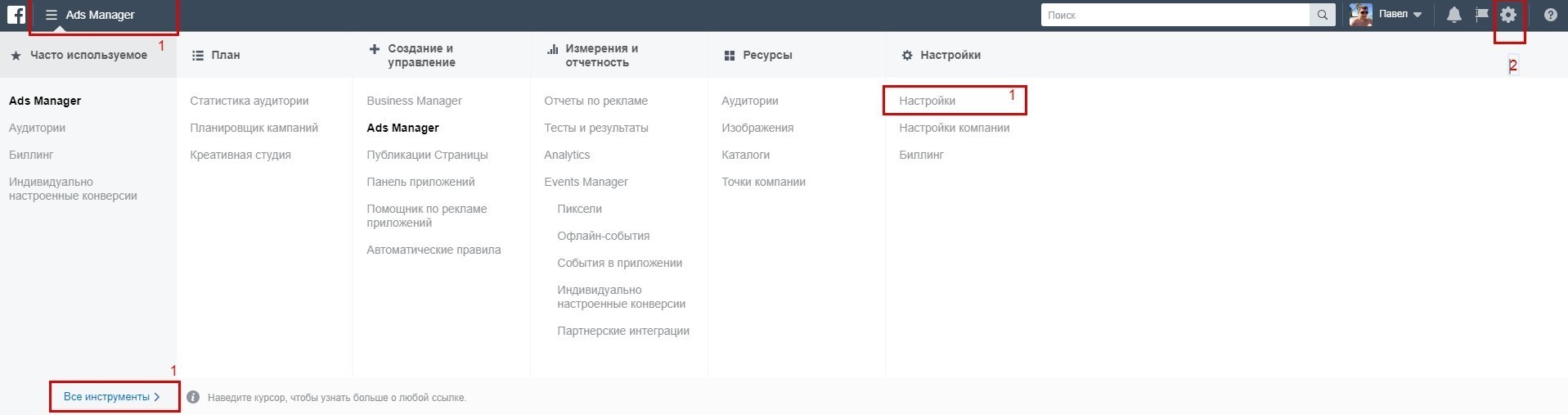 Находясь в любом доступном вам Ads Manager – перейдите в настройки рекламного аккаунта – Меню – Все инструменты – Настройки, либо просто нажмите кнопку в виде шестерёнки в правом верхнем углу окна.