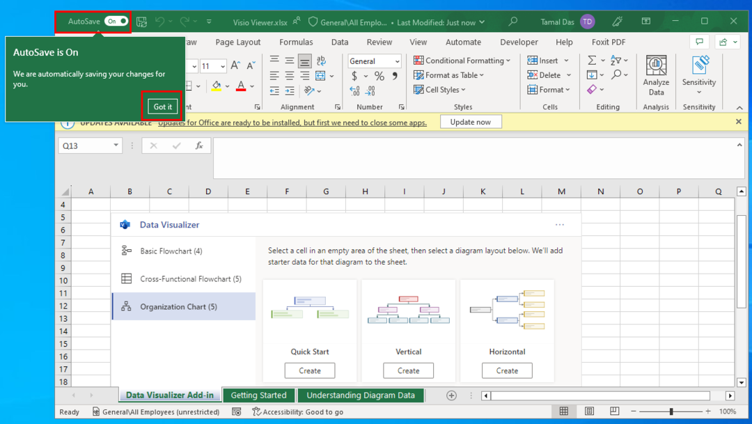 - Если синхронизация прошла успешно, вы увидите, что Автосохранение включено автоматически вместе с уведомлением от Excel.