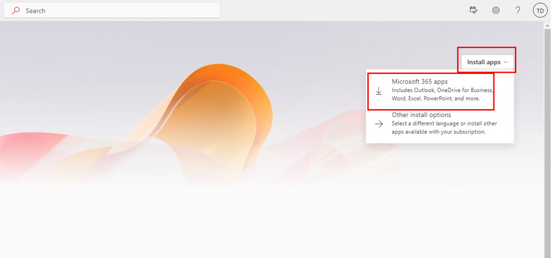 - На экране Добро пожаловать в Microsoft 365 посмотрите на правую сторону для Установить приложениявыпадающий список.