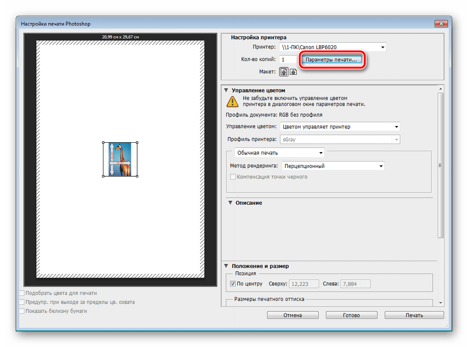 Для удобства обрезки после печати в окне предварительного просмотра переместите фото по центру или сместите к одному из краев.