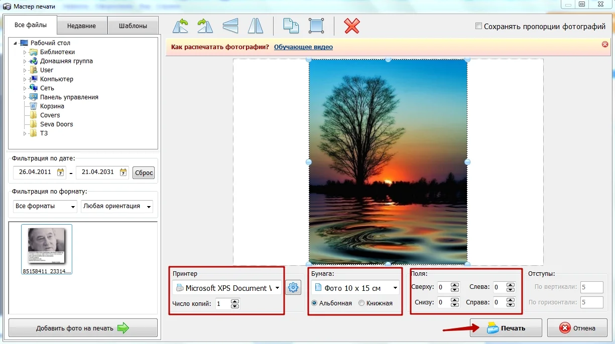 Самым простым, если фото сразу создано под печать в нужном формате, является использование встроенного в ОС Windows средства для просмотра фотографий. Если же нужно не только печатать, но и делать коррекцию, то придется прибегнуть к более профессиональным средствам работы с графикой.