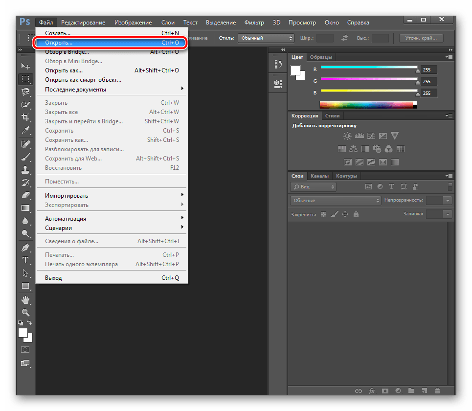 Запустите «Фотошоп», добавьте графический файл в рабочую область редактора через меню «Файл»-«Открыть».