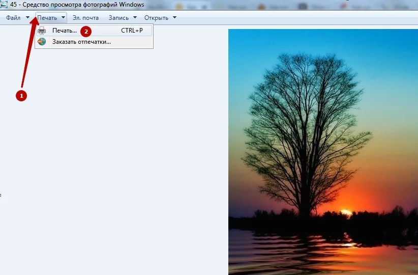 Или открываете фотографию двойным нажатием левой клавиши мышки и сверху на панели меню выбираете «Печать».