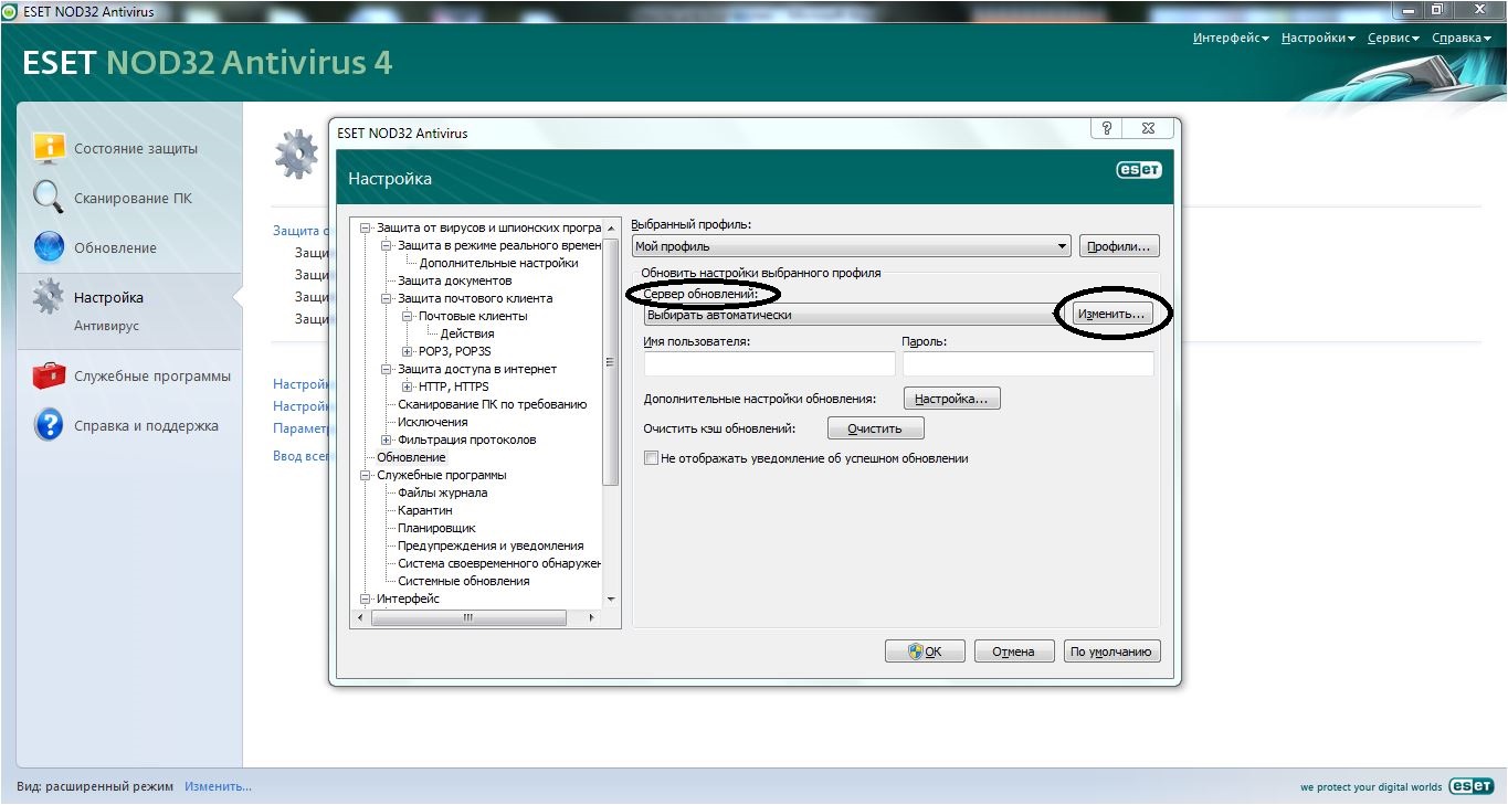 8. Теперь у нас появилась возможность изменять сервер обновлений. Копируем сервер из списка выше и добавляем его в антивирус. Открываем антивирус настройки, перейти к расширенным параметрам, в строке сервер обновлений нажимаем изменить.