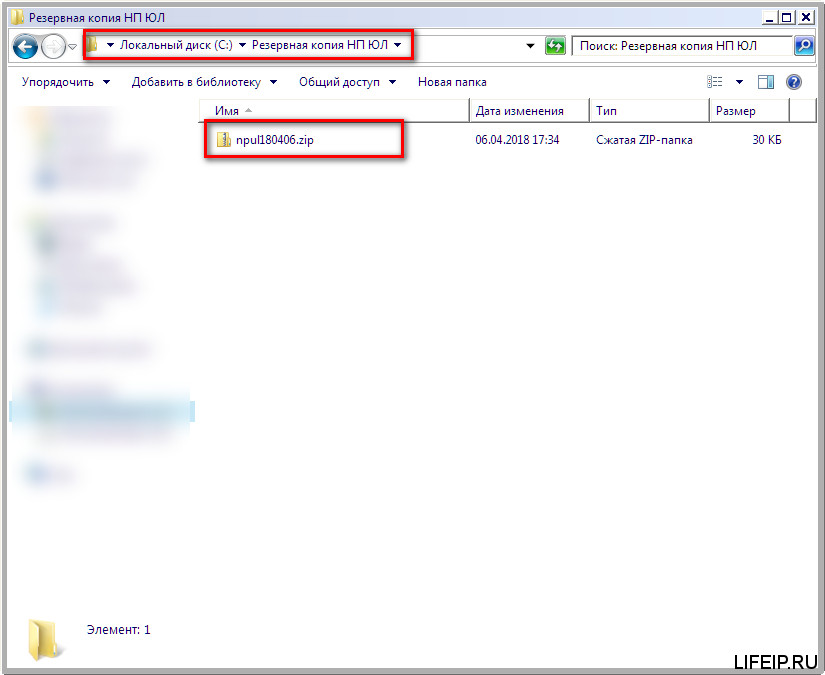 У меня путь к резервной копии выглядит так «C:\Резервная копия НП ЮЛ», в этой папке у меня лежит файл с резервной копией.