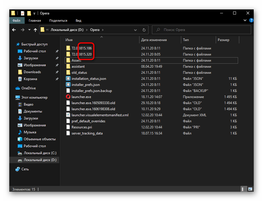 - Внутри папки с Оперой может быть несколько папок с версиями. Ориентируясь на последние цифры, выберите наиболее актуальную (чем больше цифры, тем новее версия). Папку со старой версией можно удалить, так как в ней кроме ненужного файла формата LOG (журнал с некоторыми сведениями) ничего не содержится.