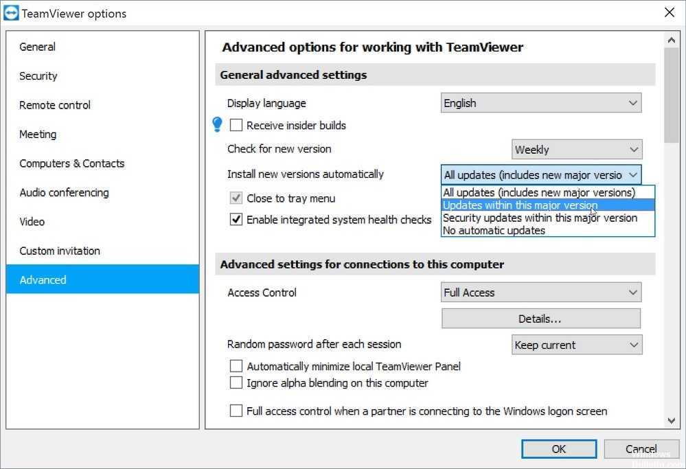 - Один (или оба) компьютера не настроены для предоставления полного доступа — наиболее распространенная причина этой ошибки — когда TeamViewer настроен на запрет полного контроля доступа. Это может произойти на одном или обоих участвующих компьютерах. В этом случае решение состоит в том, чтобы получить доступ к расширенным настройкам TeamViewer и настроить программное обеспечение для предоставления полного доступа.