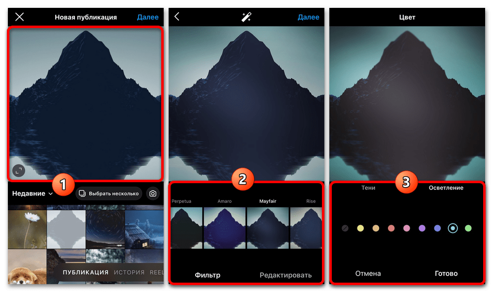 Чтобы обработать изображение в Инстаграм с мобильного устройства вне зависимости от платформы, сначала необходимо добавить файл, воспользовавшись кнопкой «+» на домашней вкладке и выбрав нужное фото из медиатеки. После этого станет доступна панель фильтров, переключение которых осуществляется при помощи жеста смахивания в правую или левую сторону.