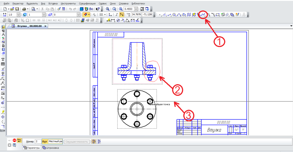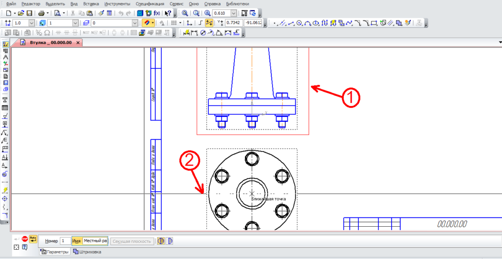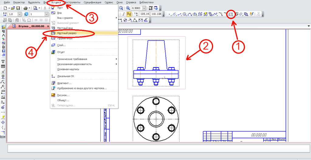 Местный разрез на чертеже в компасе можно делать двумя способами. Рассмотрим оба. Первый способ позволяет разрезать вид, линию разреза выбираем по второму виду.