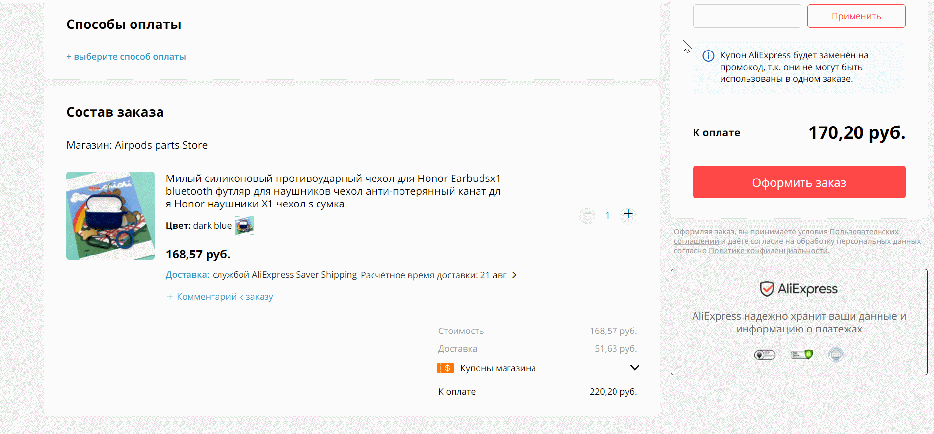 Относительно безопасности транзакций с помощью банковских карт на Алиэкспресс оставлена такая памятка: