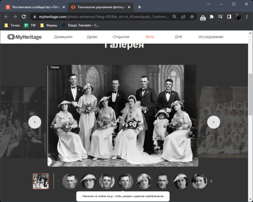 Направленность разных инструментов на сайте MyHeritage связана с генеалогическим древом, исследованием ДНК и работой со старыми семейными фотографиями, поскольку компания как раз и занимается изучением родословной. Не так давно разработчики внедрили на сайт инструмент для реставрации снимков, который может даже колоризировать их и убрать различные дефекты. На главной странице вы увидите несколько примеров работы данного инструмента и сможете убедиться в его положительном эффекте обработки.