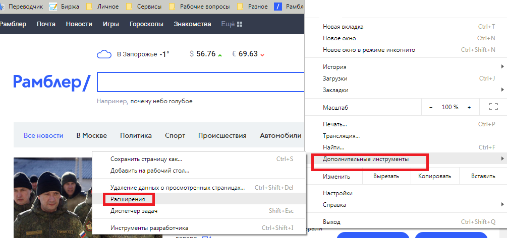 - Откроется длинное меню. В нем нажать на «Дополнительные инструменты» — «Расширения».