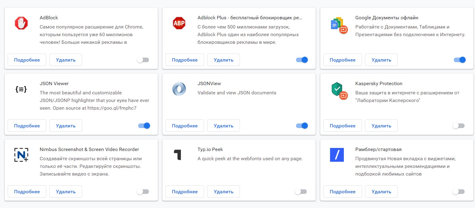 - Отобразится перечень установленных в Хроме плагинов расширений. Найдите в списке AdBlock.