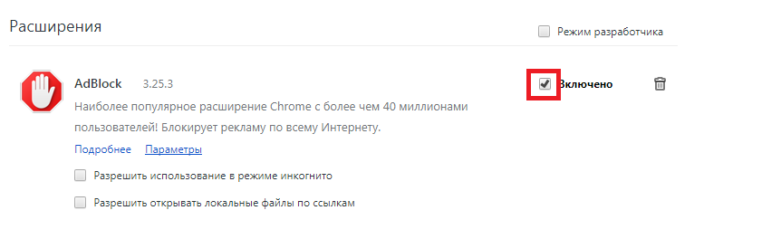 Здесь нужно найти AdBlock / AdBlock Plus и либо отключить его, либо удалить. Отключение производится ползунком, показанном на скриншоте ниже: