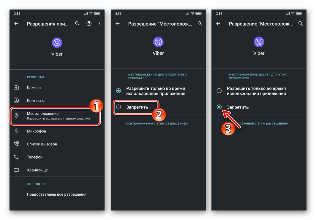 Установку запрета на передачу геоданных через Viber для Android возможно осуществить частично — средствами самого мессенджера, а также полностью – путём отзыва выданного приложению разрешения на работу с модулем определения геолокации устройства в «Настройках» мобильной ОС.