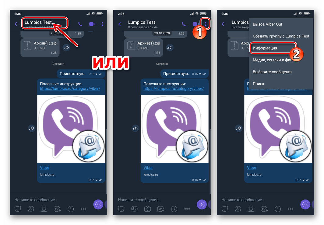 Коснитесь заголовка чата или откройте, нажав на три точки вверху справа, меню и тапните в нём «Информация».