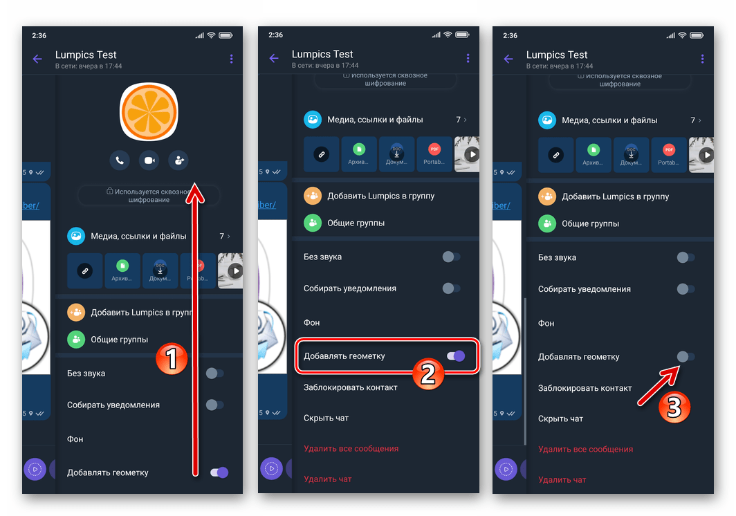 - Прокрутите открывшийся перечень настроек чата вверх, найдите наименование опции «Добавлять геометку» и переведите расположенный справа от него переключатель в положение «Выключено».