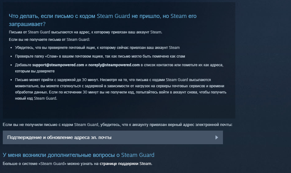 Наиболее частая причина, по которой пользователи не могут найти письмо с кодом на своей почте – попадание письма в Спам. Поищите письмо в этой папке. Для удобства настройте почтовый ящик, чтобы письма от Steam больше не попадали в Спам.
