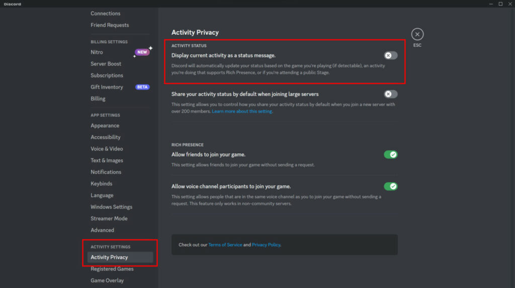 - Click “Activity Privacy” and disable “Display current activity as a status message”
