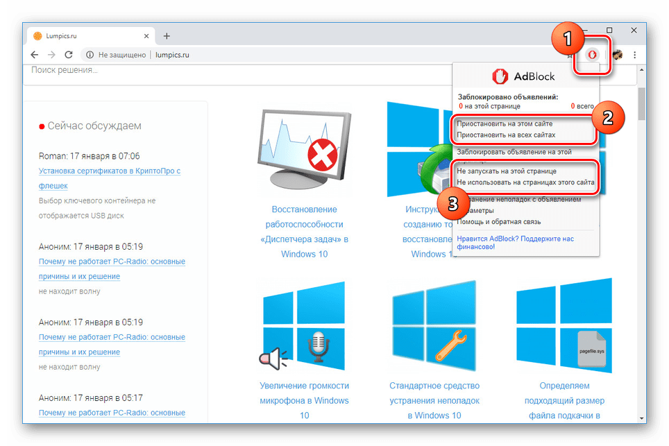 Помимо обычных расширений также существуют те, которые можно отключить не только для всех сайтов, но и для предварительно открытых. В число подобных плагинов можно отнести AdGuard и AdBlock. На примере второго процедура нами была детально описана в отдельной статье, с которой следует ознакомиться по необходимости.