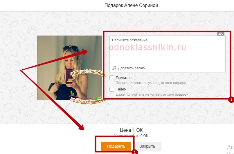 . Услуга без срока действия, стоимость которой для обычного подарка составляет 20 ОК, а для приватного – 40 ОК. Есть и более дорогие подарки: премиум 40 ОК, приватный премиум 60 ОК, музыкальный 50 ОК, приватный музыкальный 70 ОК. После принятия подарков человеком, они размещаются на аватарке на 7 суток. При отклонении подарка деньги не возвращаются, то есть Оки пропадают.