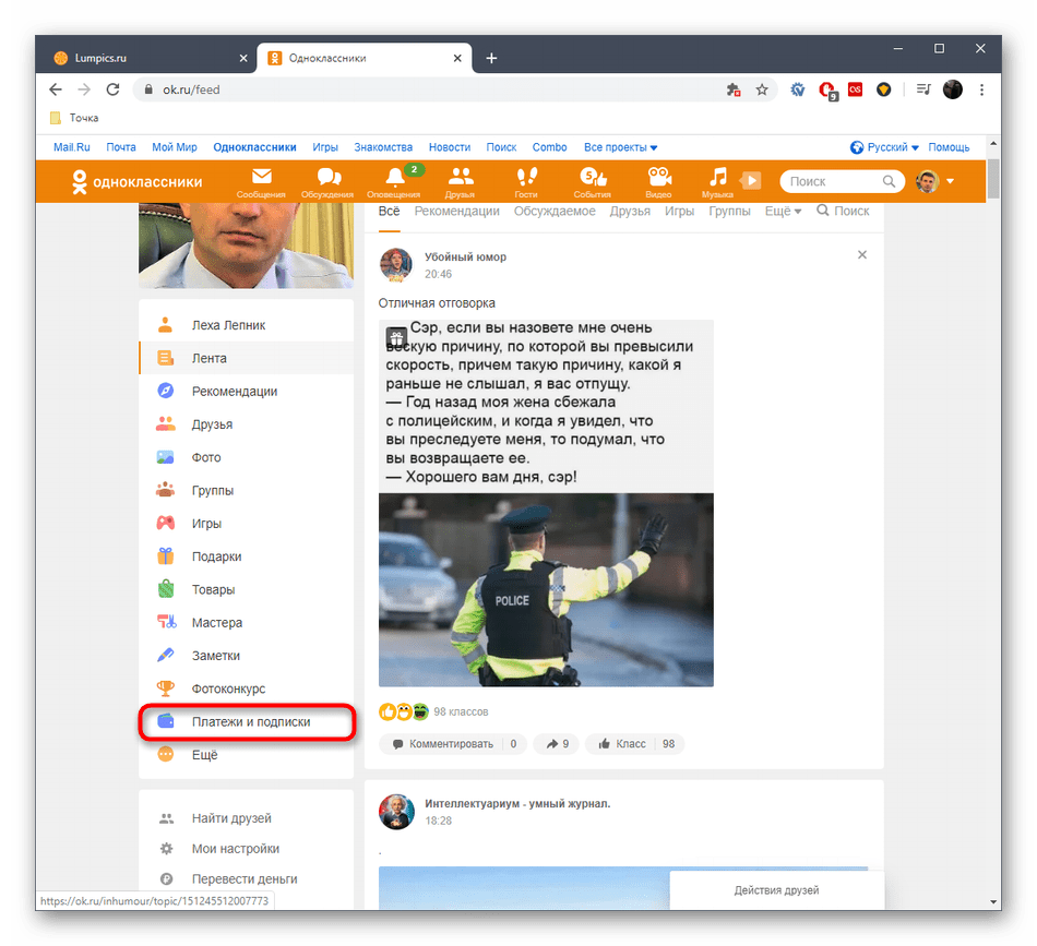 - Переходим на свою страничку в Одноклассниках и в левой боковой колонке выбираем пункт «Платежи».
