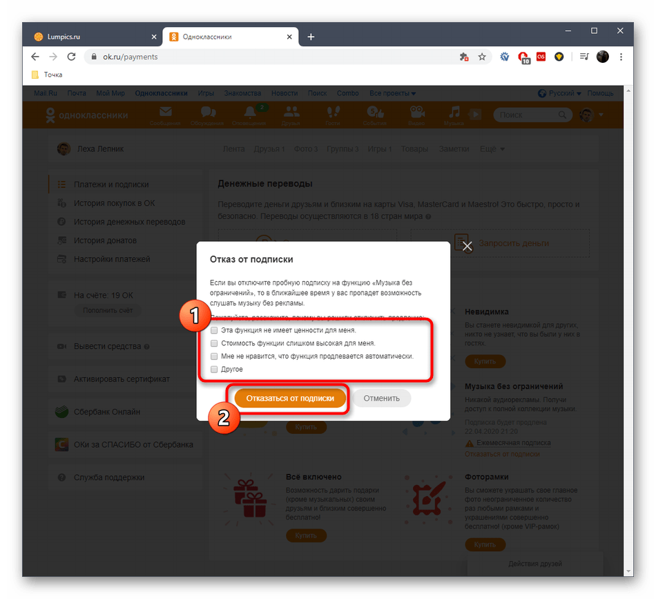 - Следуйте по пути, подробно описанном в предыдущем подзаголовке: «Купить ОКи» — «Платные функции» — галочка на «Отказаться от подписки» напротив VIP-статуса.