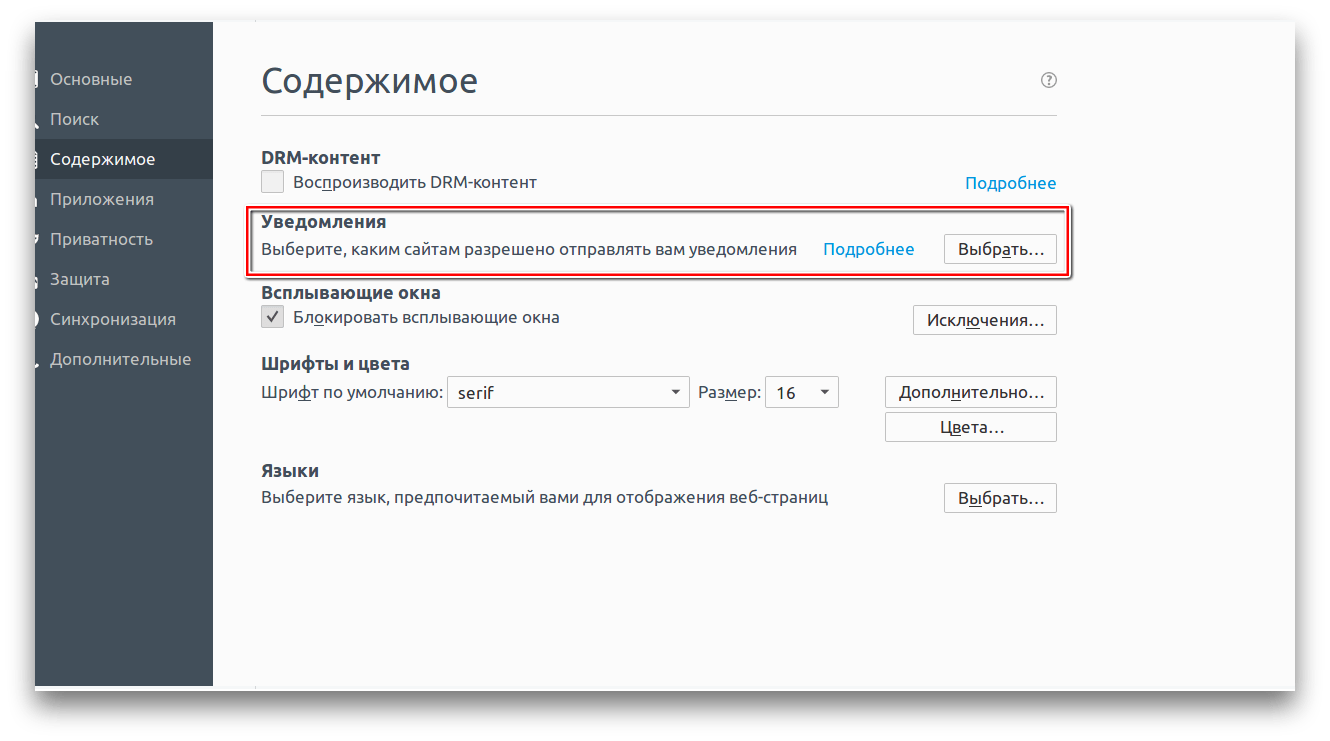 В браузере Firefox тоже можно настроить отображение уведомлений. Откройте настройки программы, а затем вкладку «Содержимое». Здесь можно задать, каким сайтам можно вас тревожить, а каким это запрещено.