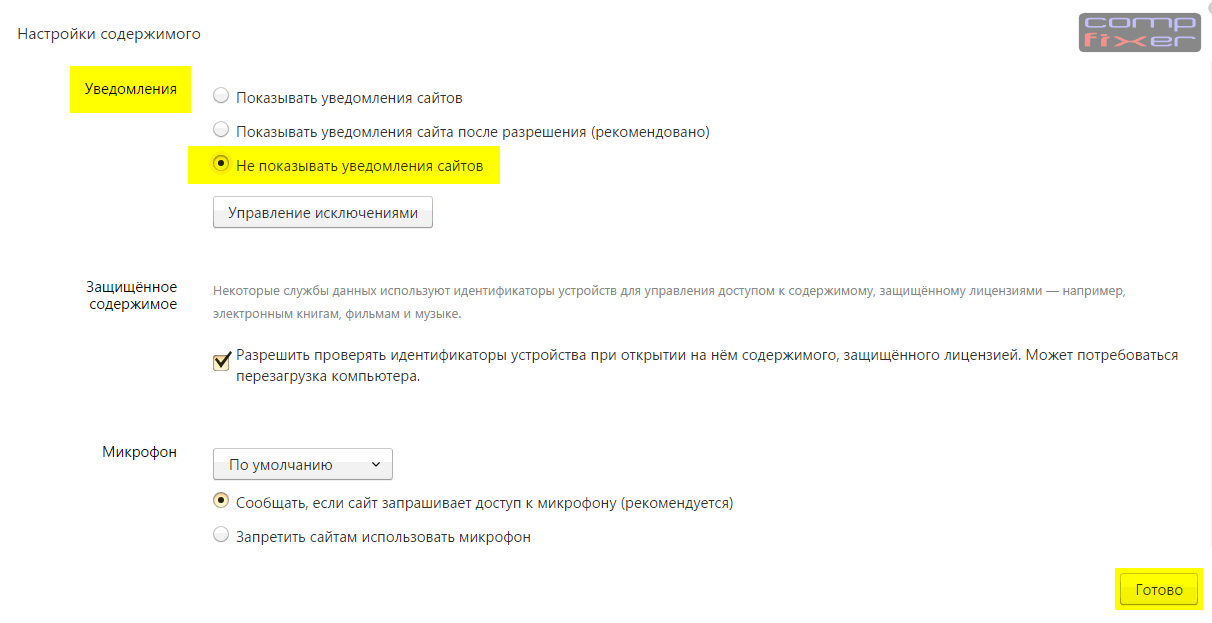 Если же необходимо отключить push-уведомления от других сайтов, потребуется зайти в «Настройки» и выбрать кнопку «Настройка содержимого» в разделе «Личные данные». Откроется окно, в котором требуется выбрать необходимый режим работы уведомлений. При этом, как и в случае с Google Chrome, можно настроить специальные правила для отдельных сайтов, если нажать на кнопку «Управление исключениями».