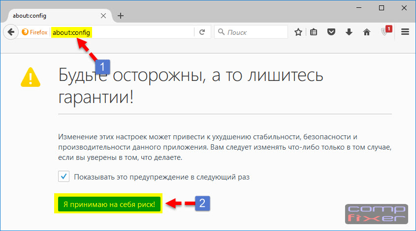 в адресную строку Firefox и нажмите Enter. В Firefox появится предупреждение о том, чтобы Вы были осторожны при использовании страницы about:config