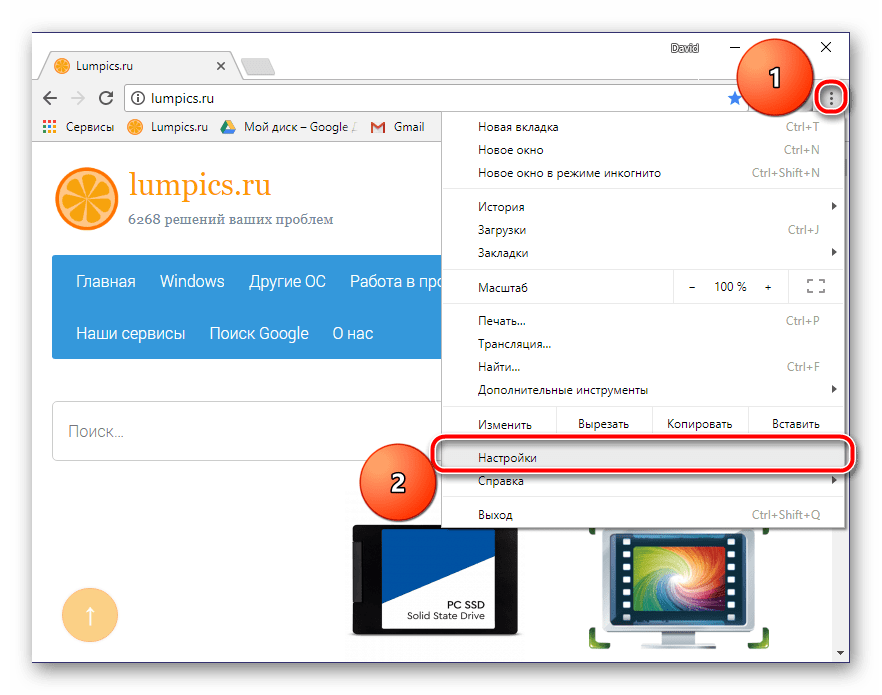 - Запустите сам браузер Google Chrome и перейдите в его настройки. Для этого в правом верхнем углу нужно нажать на три точки и выбрать пункт «Настройки»;