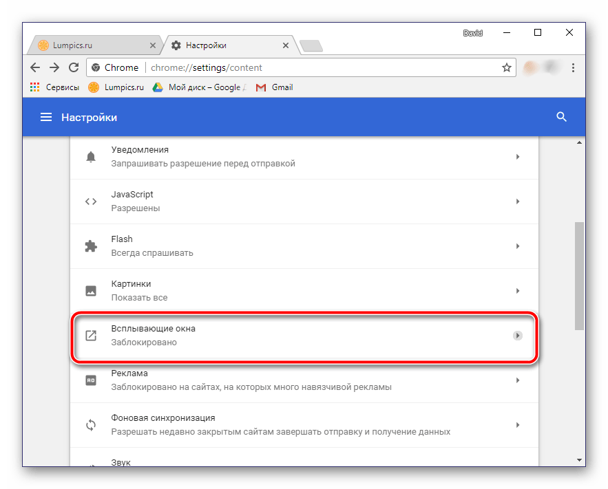 Выполнив необходимые манипуляции, вернитесь на шаг назад, нажав направленную влево стрелку, расположенную в левом углу окна, или соответствующую кнопку на смартфоне. Перейдите к разделу «Всплывающие окна»