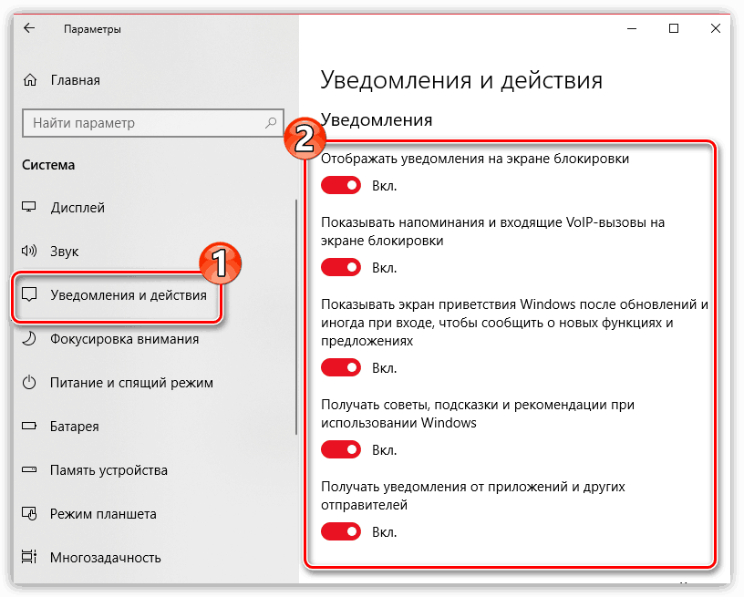 Чтобы отключить тот или иной вид оповещений, в нужном блоке установите маркер рядом с пунктом «Выкл». Внесение изменений производится достаточно быстро, но иногда может быть недоступно.