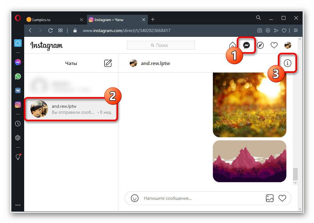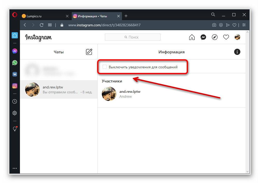 - Чтобы избавиться от уведомлений в Direct для отдельной переписки, щелкните ЛКМ по значку мессенджера на верхнем панели и выберите переписку. После этого воспользуйтесь кнопкой с изображением перевернутого восклицательного знака в правом верхнем углу над историей сообщений.