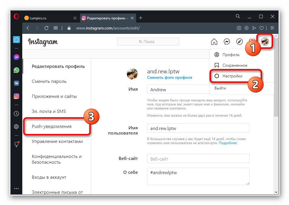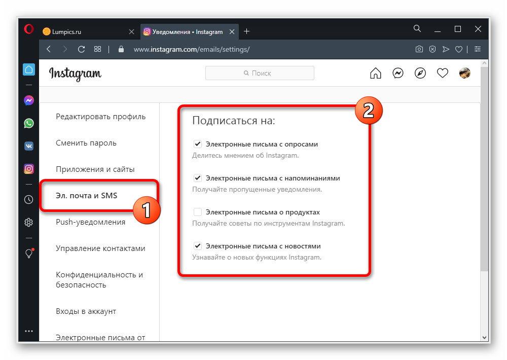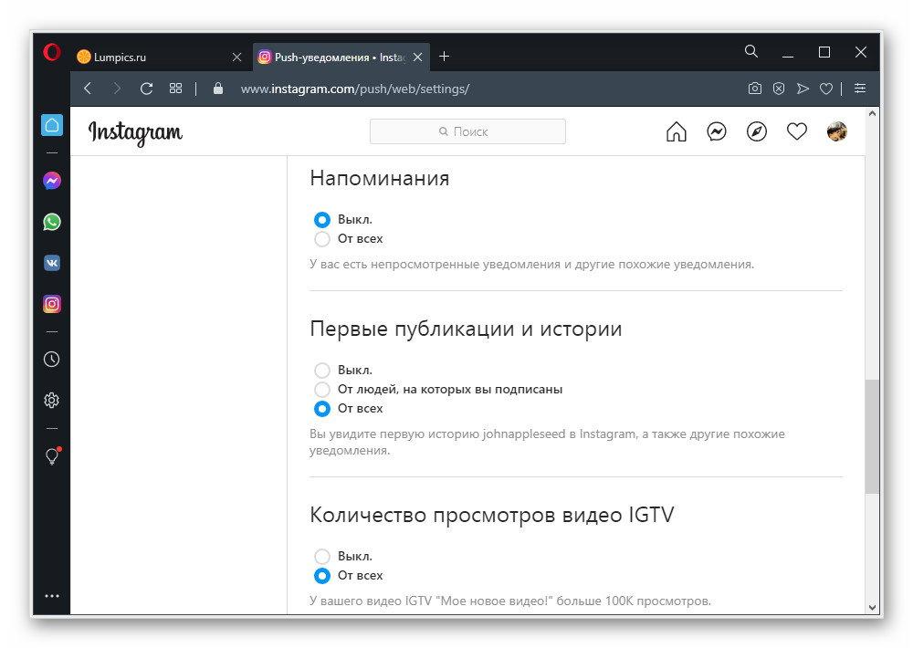 При использовании веб-сайта Instagram на компьютере отключение уведомлений можно осуществить путем изменения параметров учетной записи или браузера. Главным отличием от мобильного клиента, не считая интерфейса, в данном случае является полное отсутствие индивидуальных настроек для пользователей в подписках.