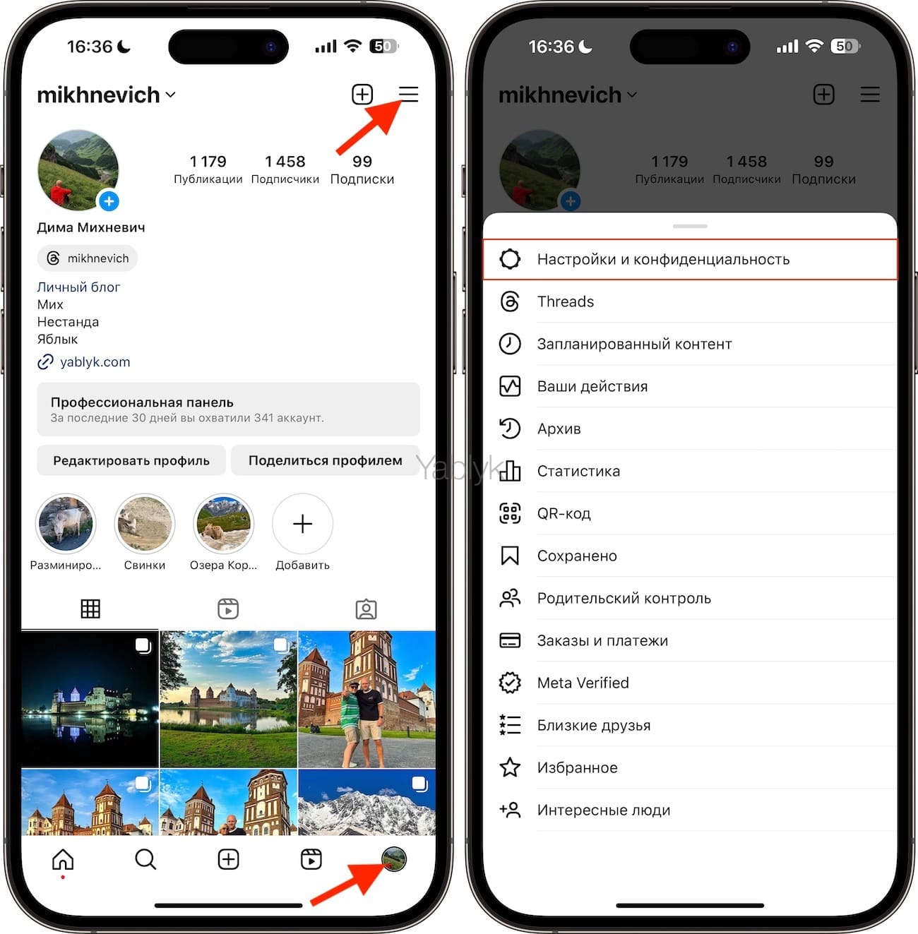 1. Коснитесь значка профиля в Instagram, выберите меню с тремя горизонтальными линиями и перейдите в раздел «Настройки и конфиденциальность».