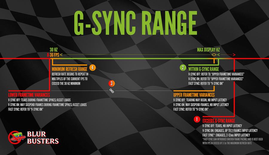Вся проблема заключается в том, что работает G-SYNC хорошо только в случае, когда FPS находится в поддерживаемом диапазоне частот обновления. Этот диапазон захватывает частоты от 30 Гц до того значения, сколько максимально поддерживает монитор (60Гц или 144Гц). То есть эта технология работает в полную меру, когда FPS не падает ниже 30 и не превышает 60 или 144 кадров в секунду в зависимости от максимально поддерживаемой частоты обновления. Выглядит очень хорошо, приведенная ниже инфографика, созданная сервисом BlurBusters.