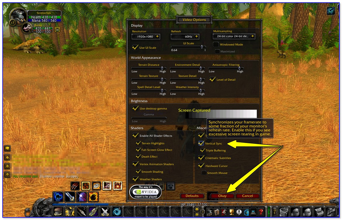 Количество FPS при вкл. и выкл. синхронизации (кадр из игры World of Warcraft)