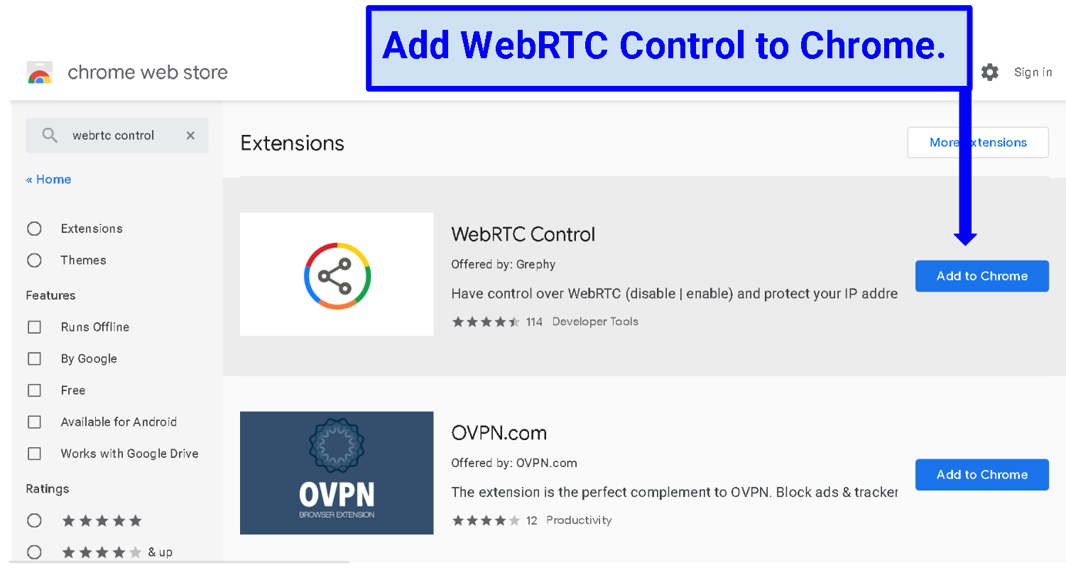 In the search field on that page, type «WebRTC Control.» The browser extension should be the first result.
