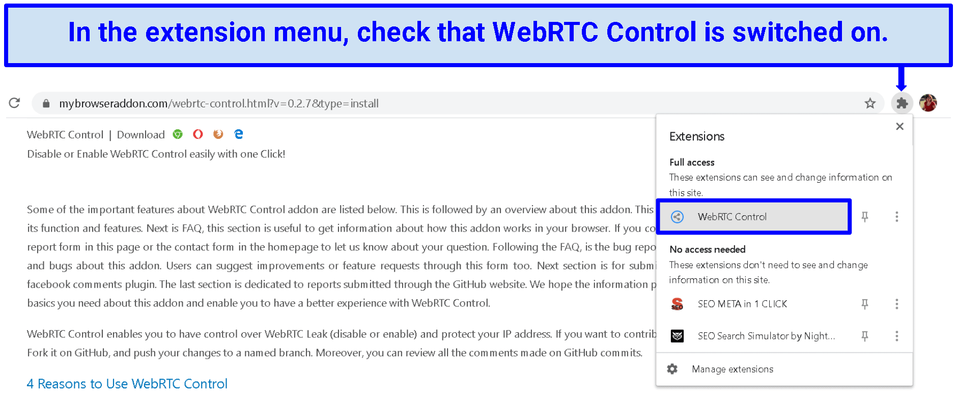 All you have to do to enable it is click «Add to Chrome,» then click «Add extension» in the dialogue box that opens. WebRTC Control will install automatically and Chrome will open a new page that includes some additional information about the browser extension.