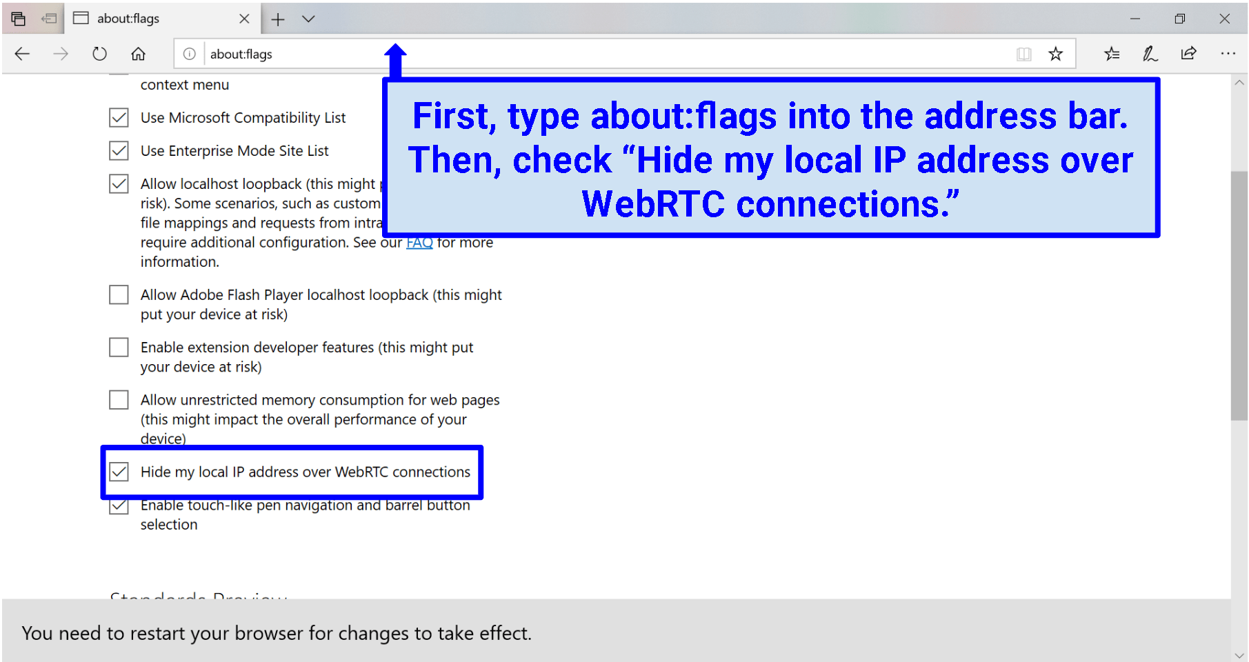 If you type «about:flags» into Edge’s address bar, you’ll see a list of developer settings. At the bottom of that list is a checkbox that says «Hide my local IP address over WebRTC connections.»