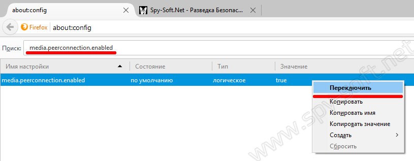 В окне настроек, в строке поиска (не в адресной строке!), как это показано на скрине ниже вводим команду media.peerconnection.enabled. Появится необходимая нам строка. Нажмем на нее правым шелчком мышки и в выпадающем меню выберем первый пункт «Переключить«.