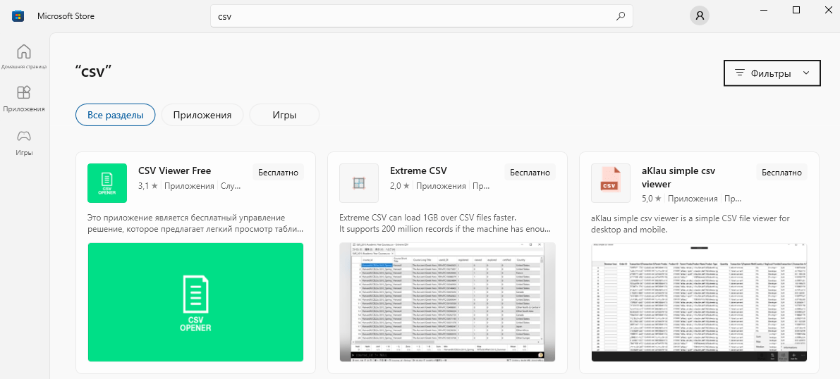 Если на вашем компьютере не установлено приложений, автоматически связанных с данным типом файлов, то вместо списка предложенных приложений вы увидите пустое место. В этом случае вам будет доступен вариант «Поиск в Microsoft Store» или «Выбрать другое приложение». Нажав на этот вариант, можно найти подходящее приложение через Магазин Microsoft или выбрать другое приложение для работы с CSV.