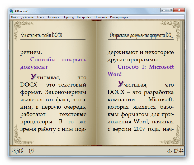 Поддерживают просмотр изучаемого формата и некоторые представители софта для прочтения электронных книг («читалки»). Правда, пока что указанная функция присутствует далеко не у всех программ данной группы. Читать DOCX можно, например, при помощи «читалки» AlReader, которая отличается очень большим количеством поддерживаемых форматов.