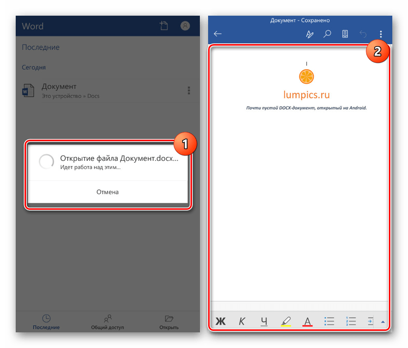 Как было сказано ранее, рассматриваемые форматы в первую очередь предусмотрены для официального программного обеспечения Microsoft Word, и потому именно этот вариант пользуется большой популярностью среди пользователей. Нужное приложение мало чем уступает аналогичной программе на ПК и может быть загружено бесплатно из магазина Гугл.