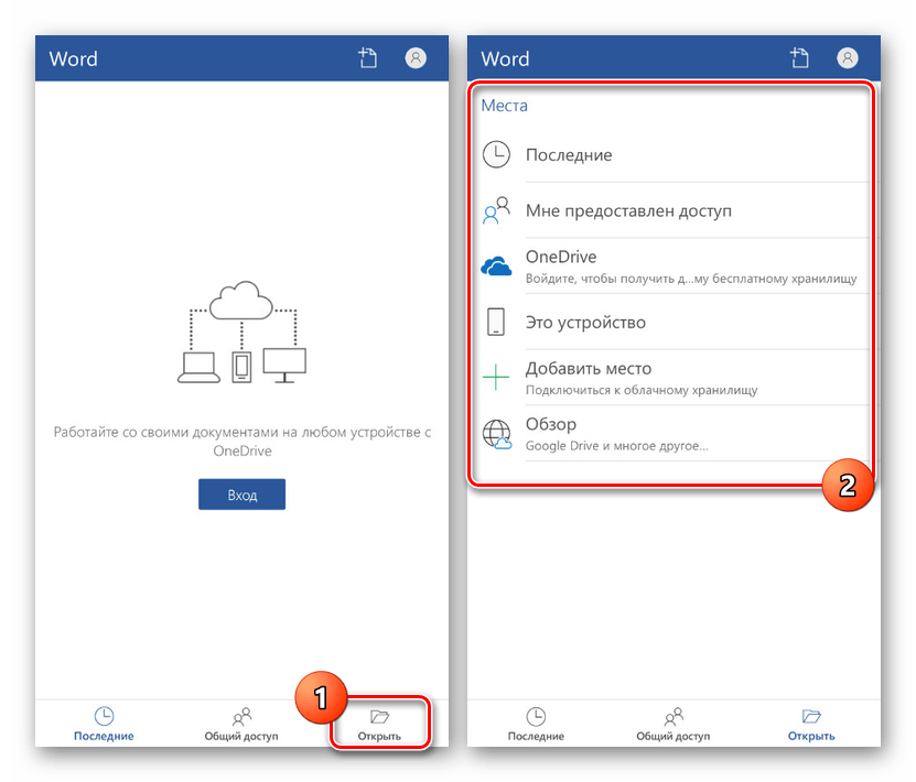 Находясь на стартовой странице, нажмите кнопку «Открыть» на панели в нижней части экрана. После этого через появившееся меню выберите один из вариантов расположения файла, например, в нашем случае «Это устройство».