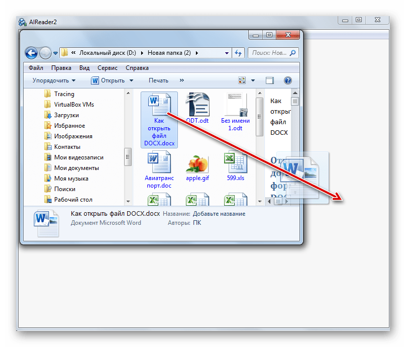 Открытие документа можно произвести и путем перетягивания из Проводника в графическую оболочку «читалки».