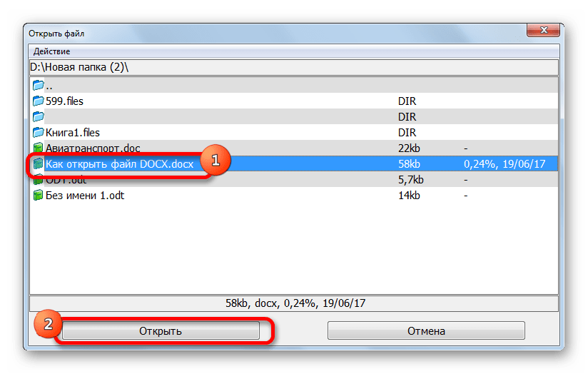 - Инструмент открытия книги запущен. Он имеет не совсем привычную форму. Перейдите в данном окошке в ту директорию, где локализирован объект DOCX. Требуется произвести обозначение и нажать «Открыть».